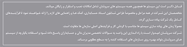 در جریان تولید سیستم های مالی تمامی اصول مرتبط با حسابداری و تمامی فعالیت های عمومی مالی چه در سطح عملیات و چه در سطح گزارشات اساسی، در سیستم ها دیده شده است و رفتارهای سازمانهای غیرخدماتی نیز کاملاً در نرم افزارها لحاظ گردیده تا سایر استفاده کنندگان در شرکتهایی که فقط برای فعالیت مالی و بازرگانی و یا تولیدی بخواهند از این راهکار استفاده کنند نیز قابلیت و کارایی بالایی داشته باشد.